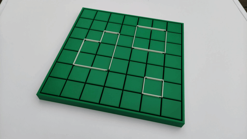 The model consists of a board with vertical and horizontal lines. Small tiles can be inserted into these lines to create tactile lines. This allows geometric shapes such as quadrilaterals (parallelograms, trapeziums, rectangles) or other shapes to be reproduced in a tactile form.